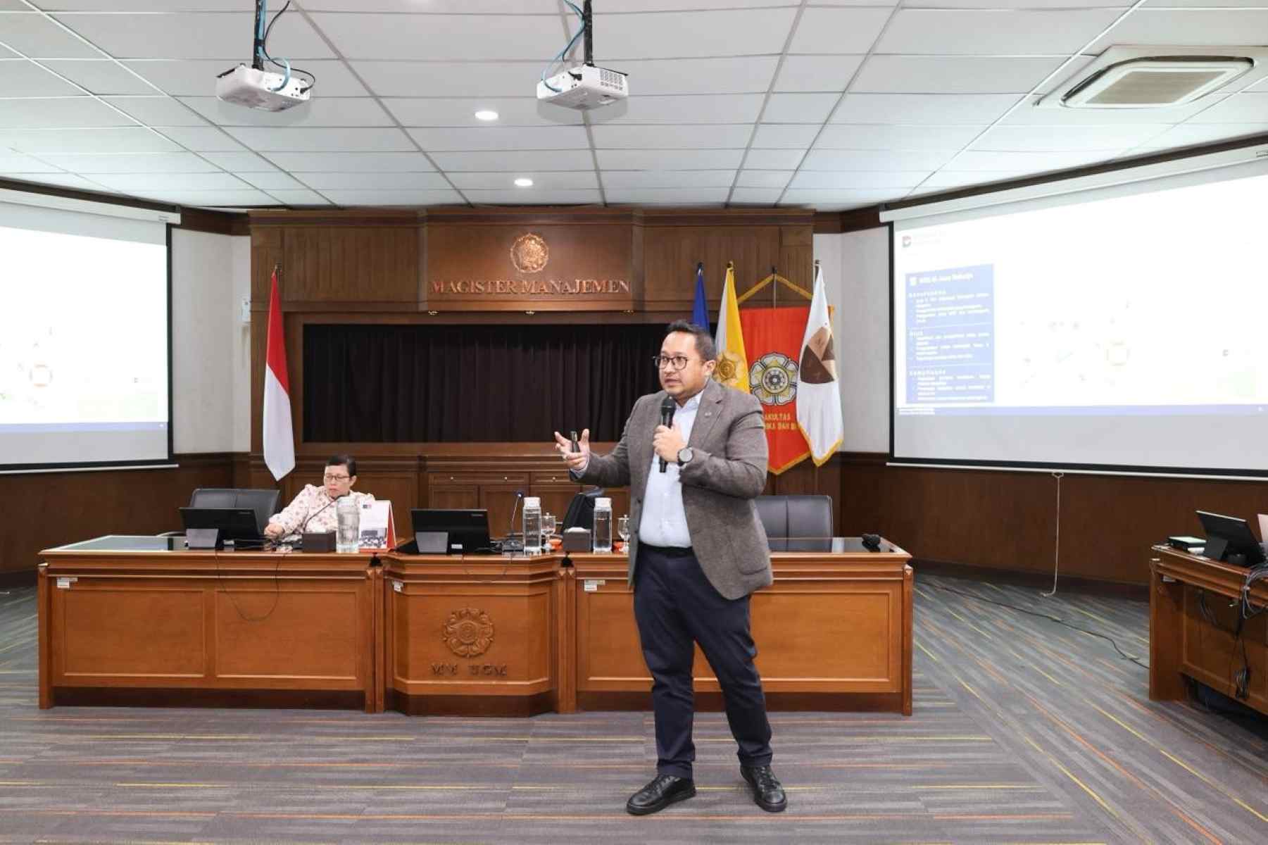Prof. Amin Wibowo, Ph.D., dalam sambutannya menyampaikan apresiasi dan terima kasih kepada Harwan Muldidarmawan. Ia menyampaikan bahwa kehadiran praktisi dalam perkuliahan memberikan kesempatan bagi mahasiswa untuk memperoleh first-hand experience terkait implementasi Business Ethics for Sustainability di dunia industri.